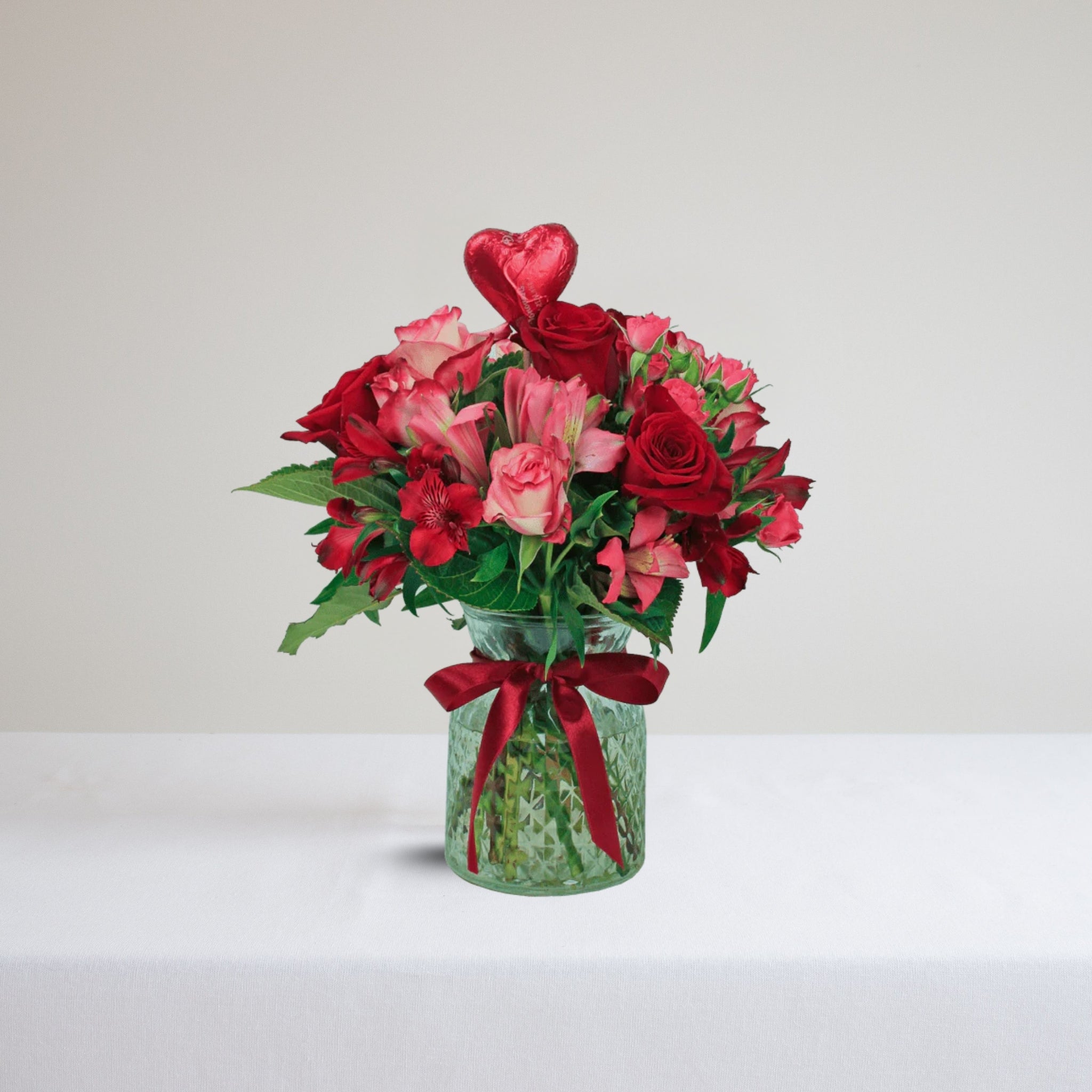 Styled as a hand-tied posy and presented in a keepsake glass vase, the arrangement is finished with a heart-shaped chocolate for an added touch of sweetness. Flower varieties may vary with seasonal availability, but we always select the freshest, most beautiful blooms on the day of delivery.